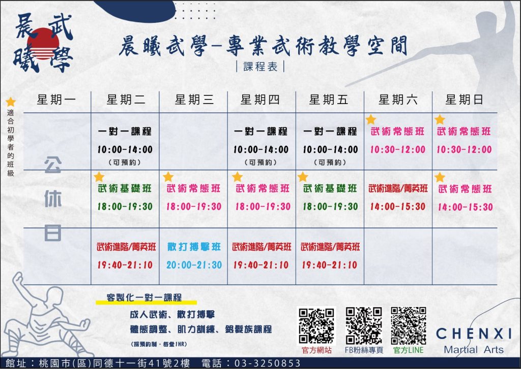 寒暑假營隊則是以武術為主軸進行延伸,拓展到不同的面向,曾推出武俠營(從武俠出發,讓武術的精神、文化以至於兵器、動作及醫藥等元素一一進入孩子們的想像及生活之中)、動物武友會(陪著孩子們在動物的世界裡發想,甚至置身於動物園裡,從模仿動物的姿態形貌以至於動作功法)、武劇創作營等各式結合武術及中華文化的營隊。
